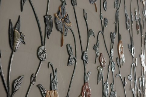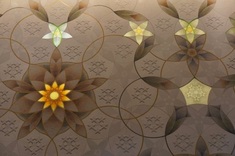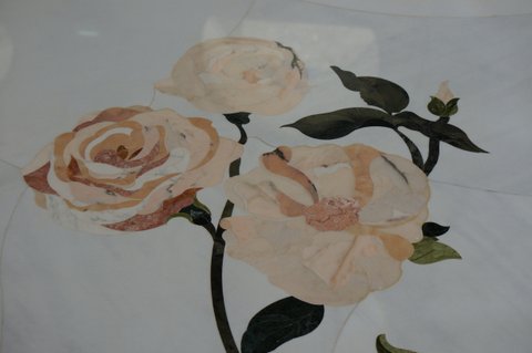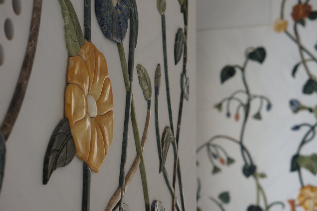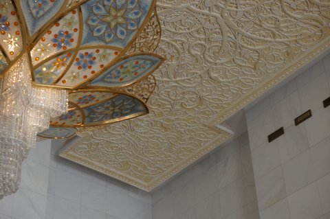 The use of inlaid marble to create flower patterns on the floor continued inside the Mosque as illustrated by the roses on the left. Think of the hours it must take to make such an image. The two right images show another way of creating flowers from stones. These flowers are carved out of stones and stuck on the wall somehow. They are not marble stones obviously. The 3D effect gives them a tangible substance. There is another photo above near the entrance showing a larger picture of the 3D flowers installation.